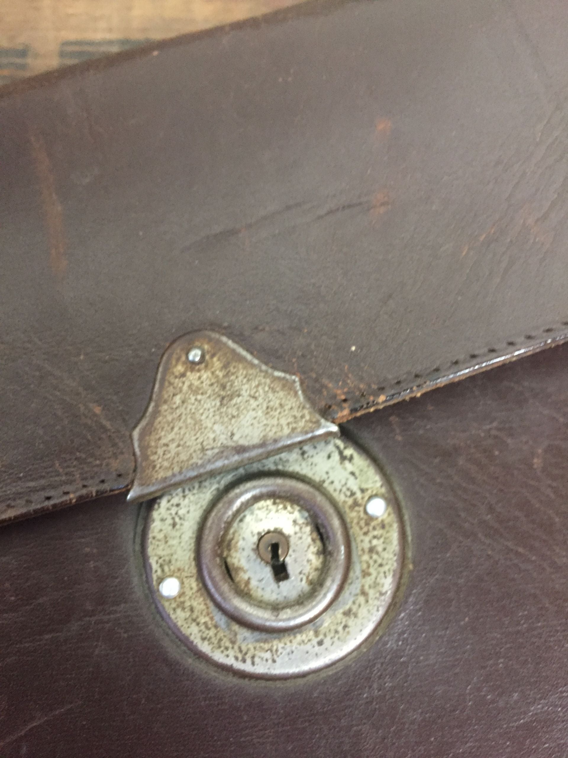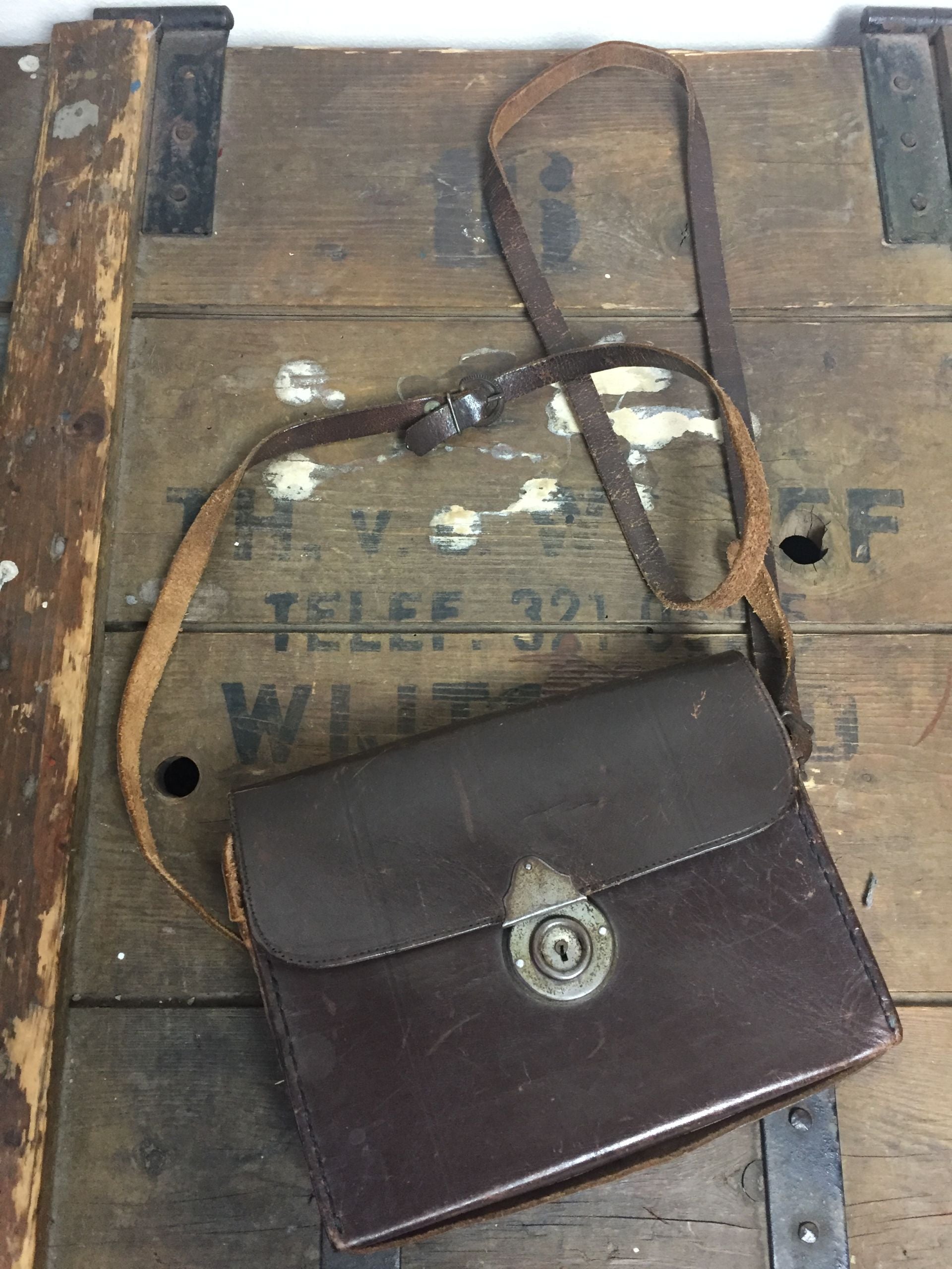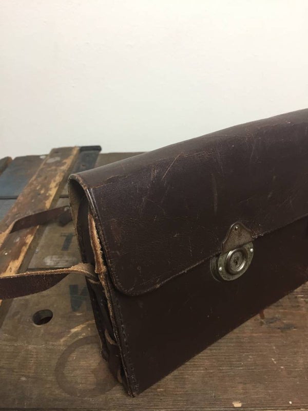 Vintage tas, bruin leder met de gebruiks sporren van de jaren 1955